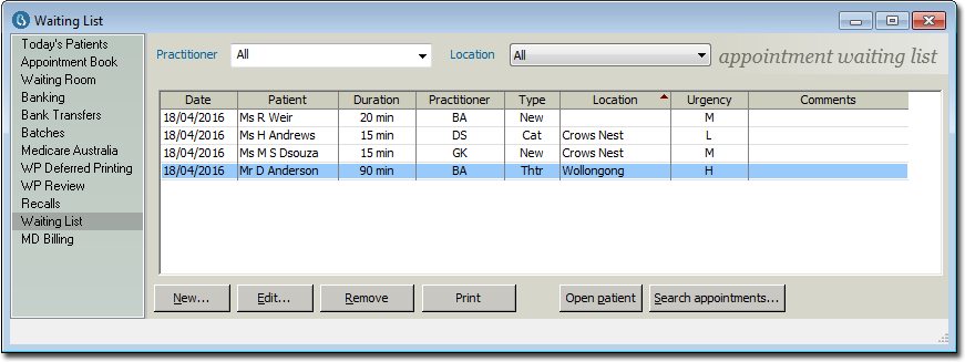 The Waiting List provides a mechanism for creating and managing a list of patients when no suitable, free slots are available in the Appointment Book. Once a slot becomes free, patients can be transferred from the Waiting List to the Appointment Book. The Waiting List should not be used for making general patient appointments, nor should it be confused with either the Waiting Room or a patient's Bookings window.