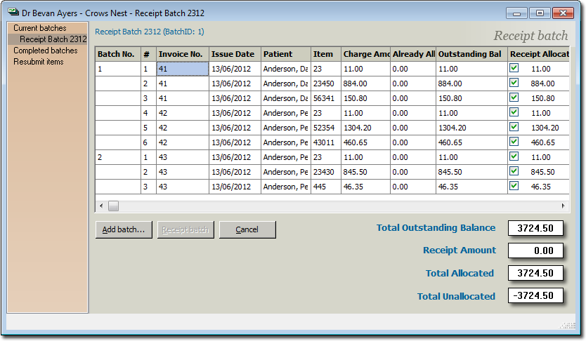 - If the amounts were the same, click on Receipt batch. If Medicare has rejected an item, click in the check box next to that item, to deselect it. If Medicare has underpaid or overpaid on an item, modify the amount paid for that item, until you have an amount unallocated of Nil. click the Receipt batch button.