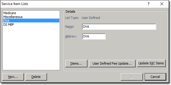 Select . The Service Items Lists window appears.