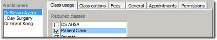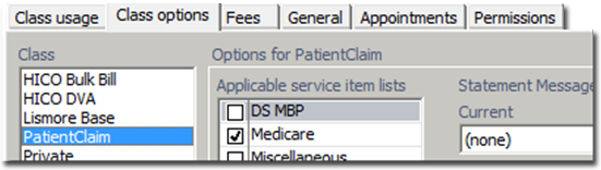 3. Select the Class Options tab. Select the Patient Claim class, and then tick the Medicare check box.