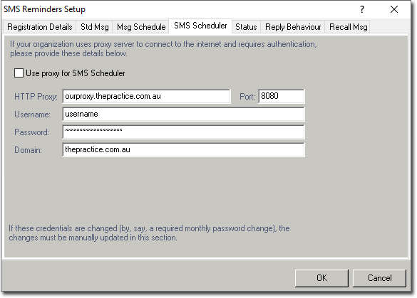 - Tick the Use Proxy for SMS Scheduler check box. The remaining fields will become active.